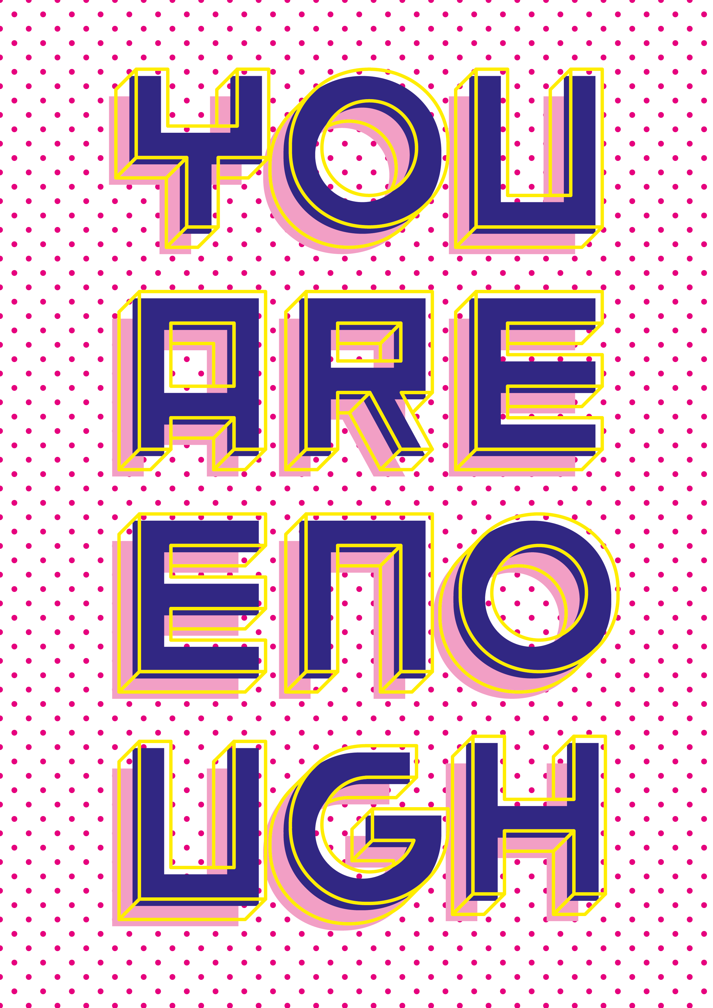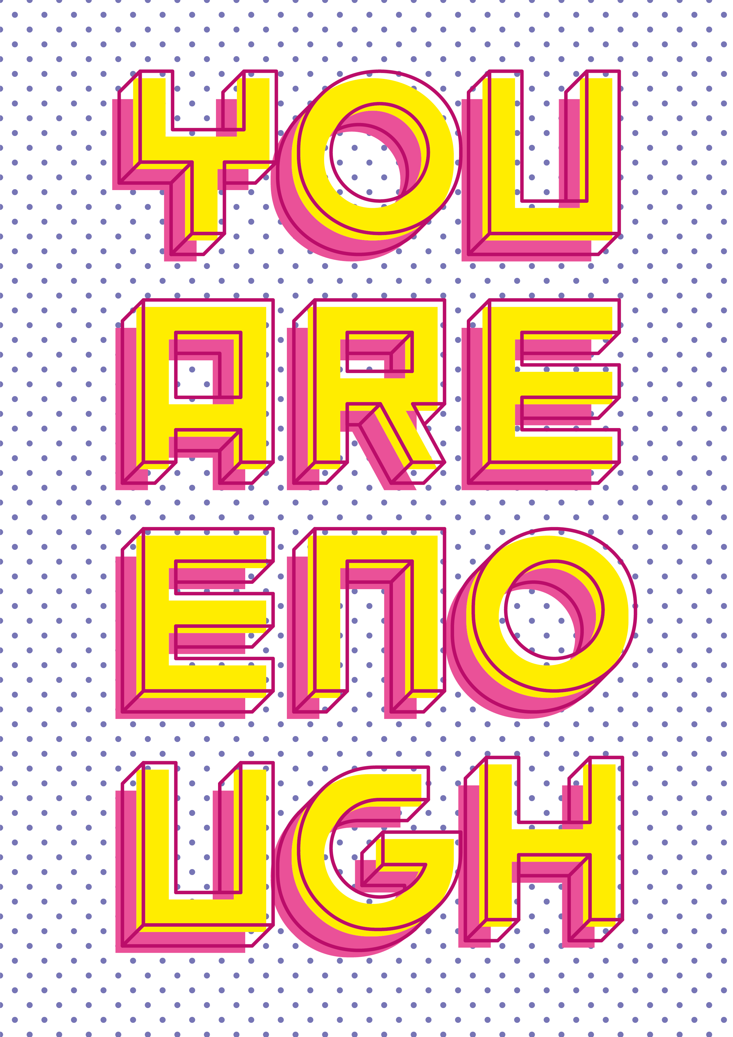 You are enough is a print series dedicated to positivity towards the customer. The design uses a structured font that has been created to mirror the slab brutalist design aesthetic. Paired with a 3D stroke and offset drop shadow creates a unique depth of perception on the viewer.