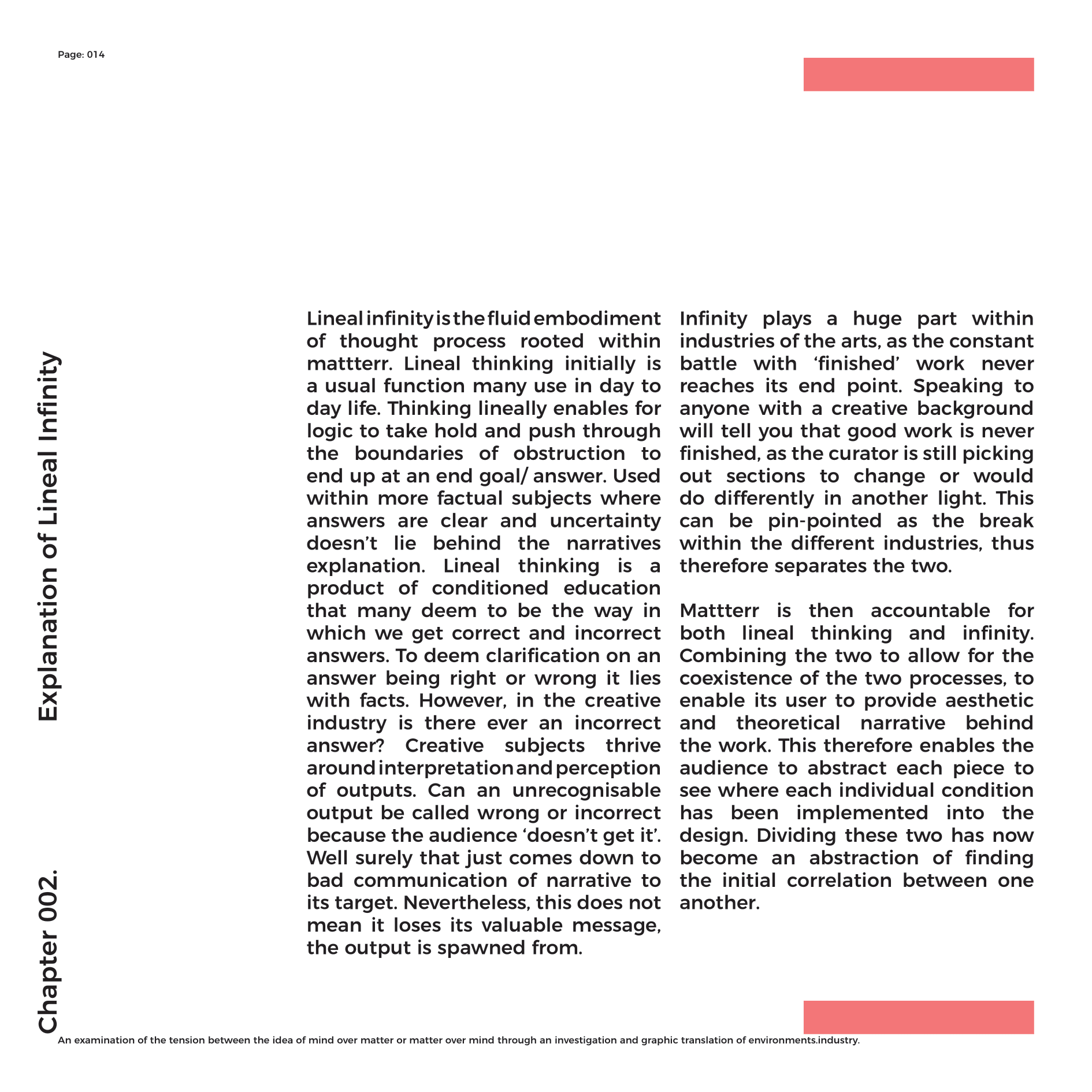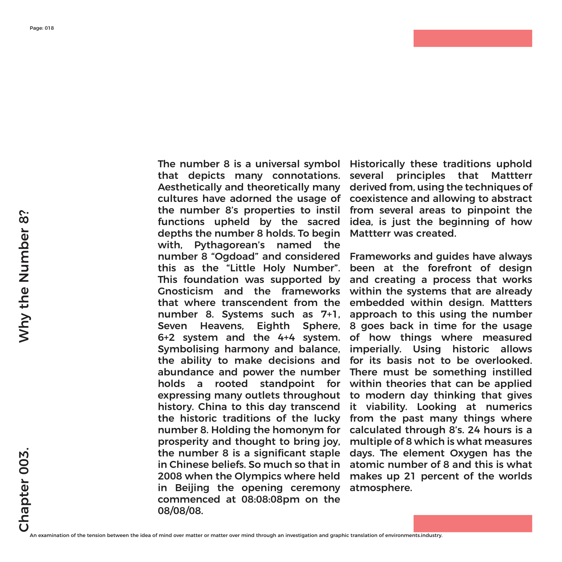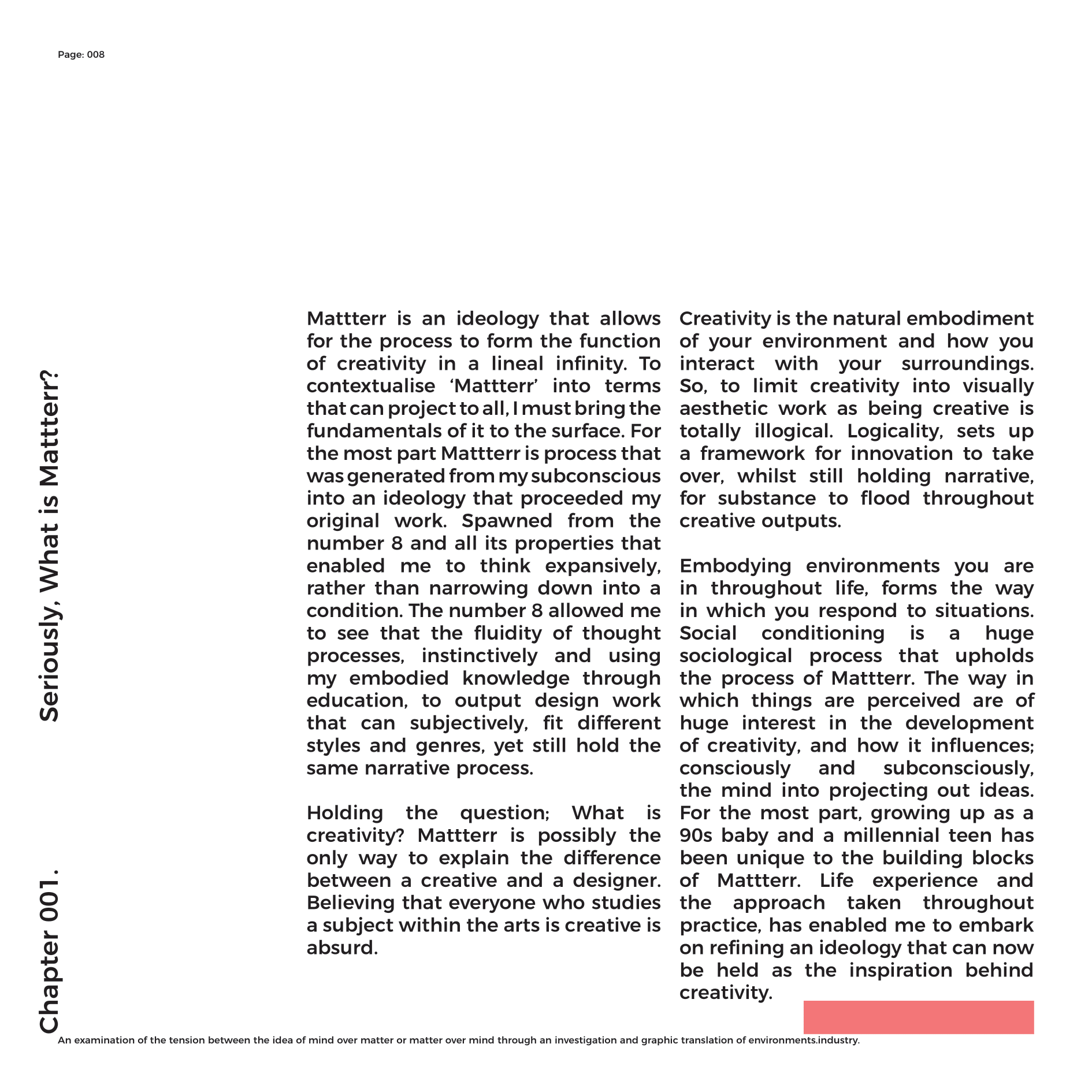 Mattterr is an ideology that allows for the process to form the function of creativity in a lineal infinity. To contextualise ‘Mattterr’ into terms that can project to all, I must bring the fundamentals of it to the surface. For the most part Mattterr is process that was generated from my subconscious into an ideology that proceeded my original work. Spawned from the number 8 and all its properties that enabled me to think expansively, rather than narrowing down into a condition. The number 8 allowed me to see that the fluidity of thought processes, instinctively and using my embodied knowledge through education, to output design work that can subjectively, fit different styles and genres, yet still hold the same narrative process. Holding the question; What is creativity? Mattterr is possibly the only way to explain the difference between a creative and a designer. Believing that everyone who studies a subject within the arts is creative is absurd. Creativity is the natural embodiment of your environment and how you interact with your surroundings.