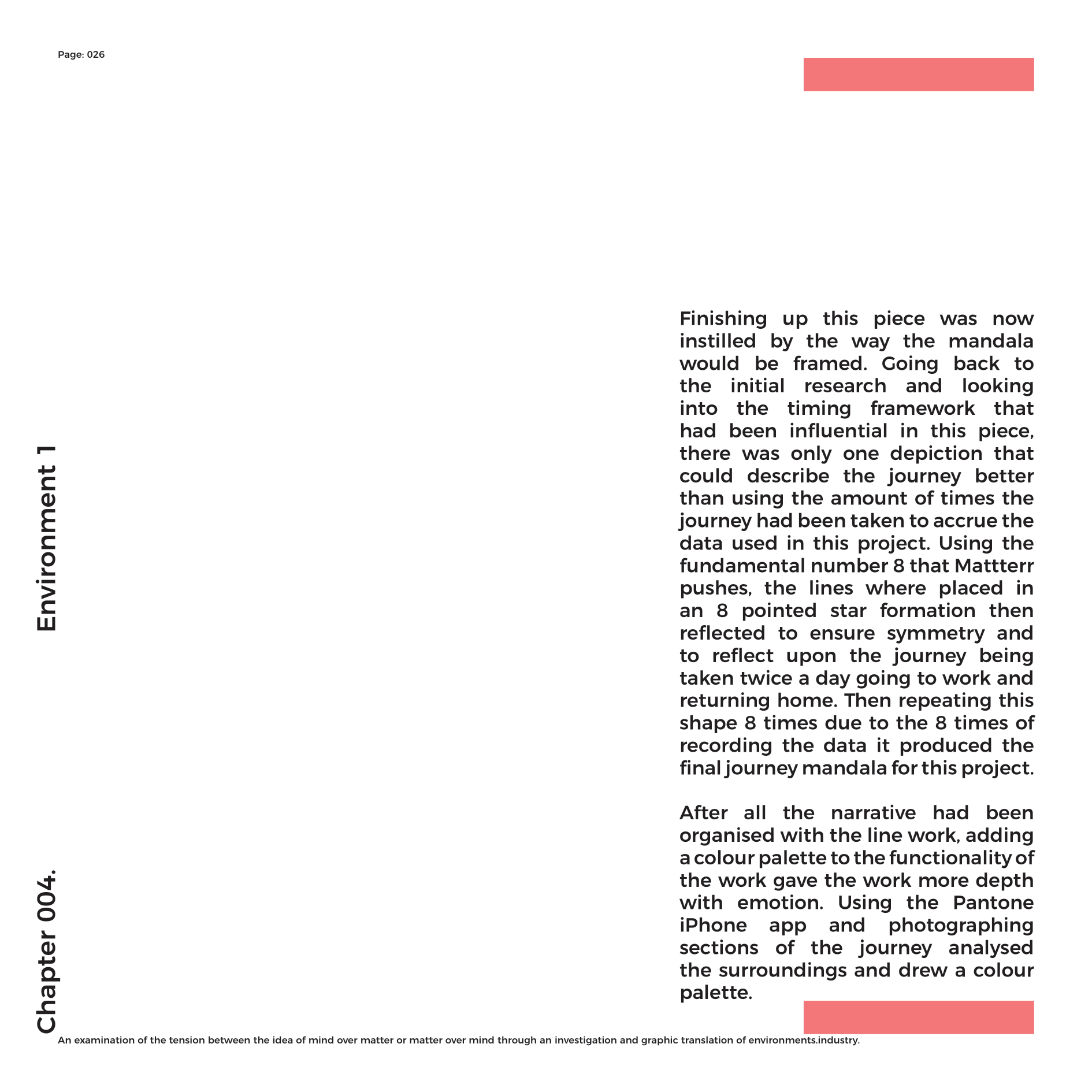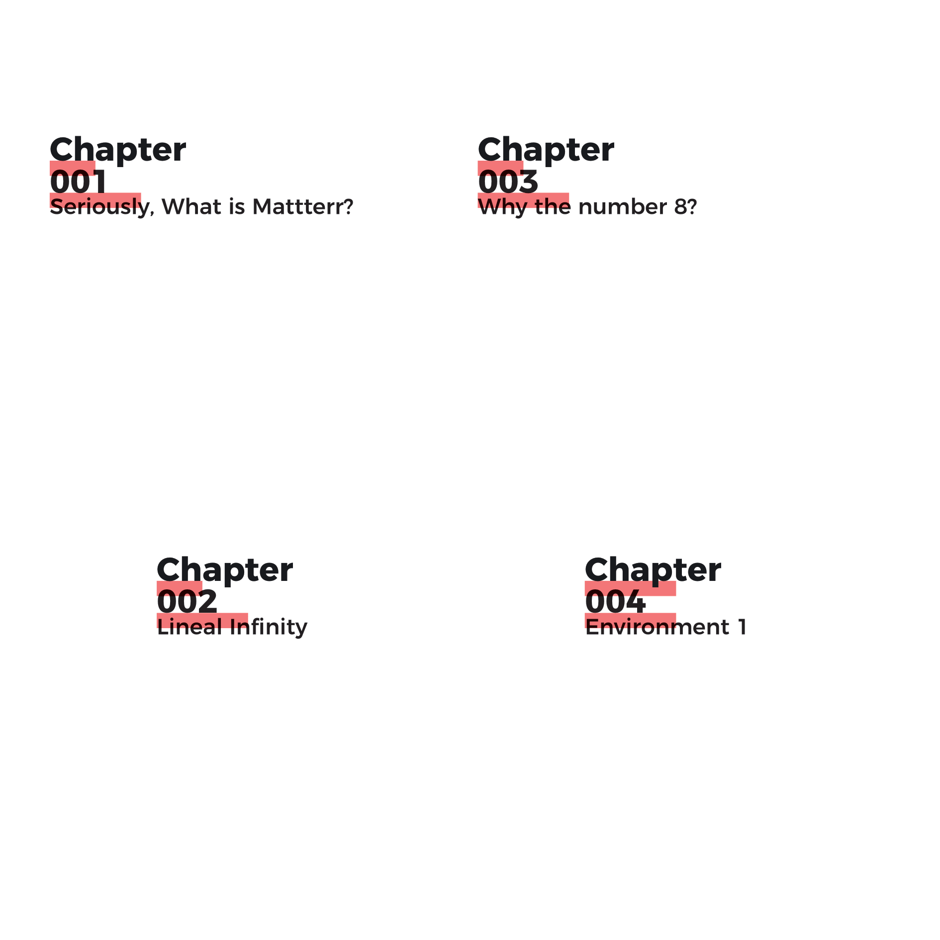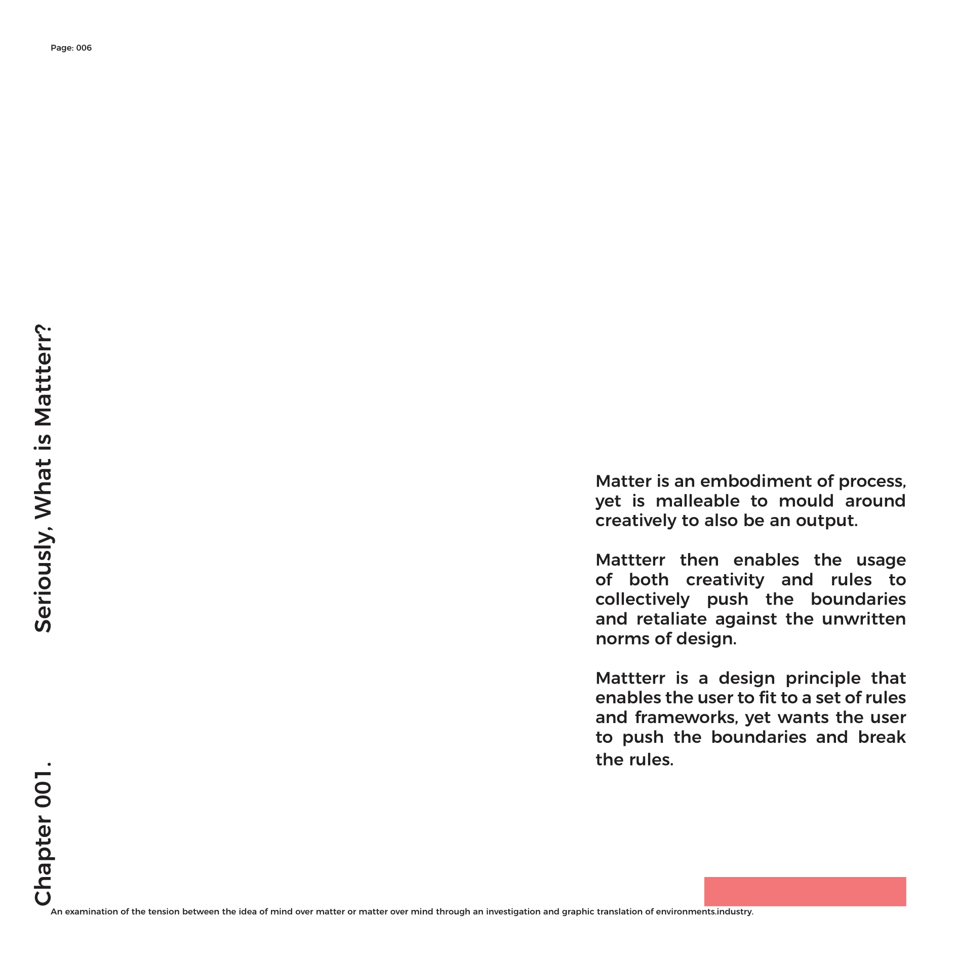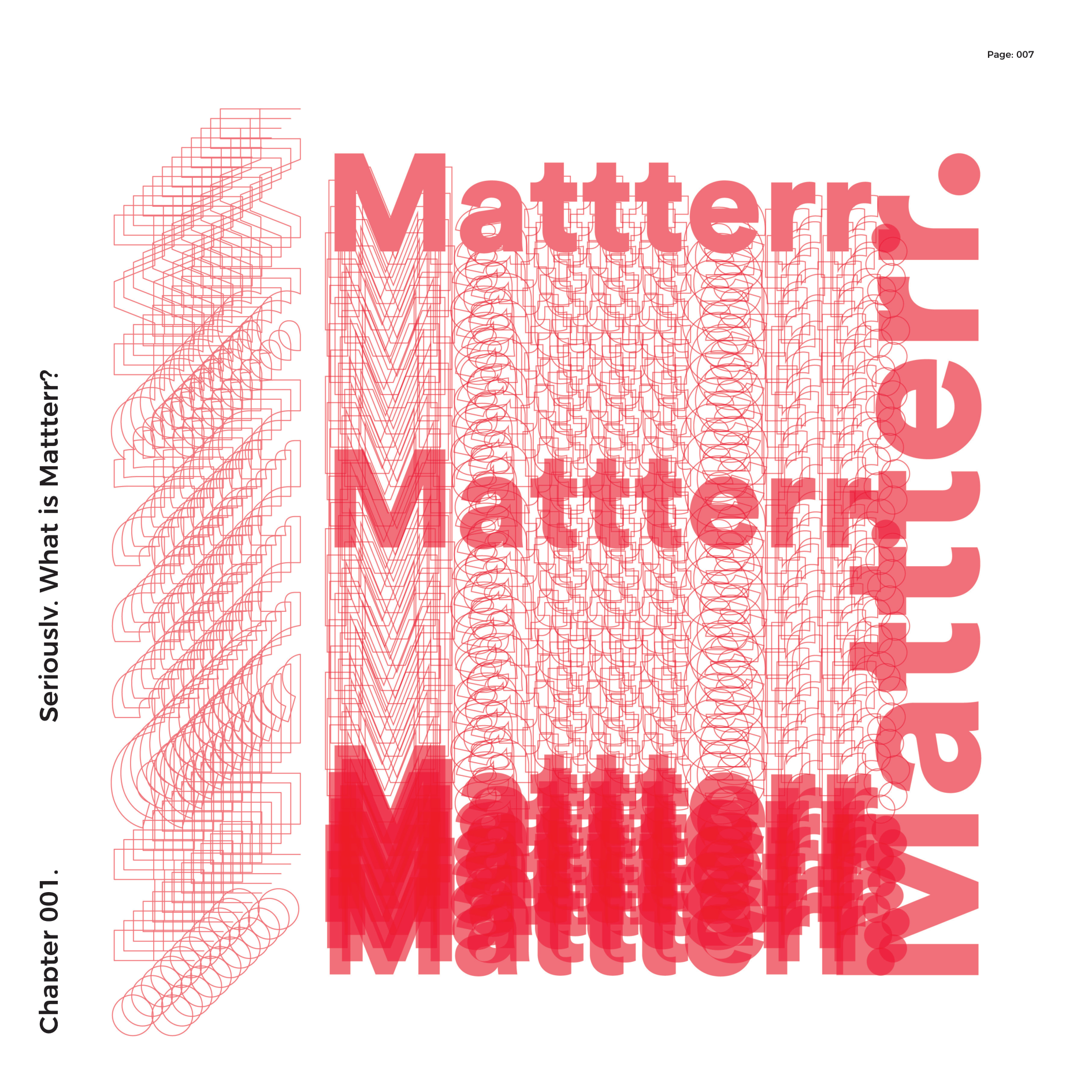 Mattterr is an ideology that allows for the process to form the function of creativity in a lineal infinity. To contextualise ‘Mattterr’ into terms that can project to all, I must bring the fundamentals of it to the surface. For the most part Mattterr is process that was generated from my subconscious into an ideology that proceeded my original work. Spawned from the number 8 and all its properties that enabled me to think expansively, rather than narrowing down into a condition. The number 8 allowed me to see that the fluidity of thought processes, instinctively and using my embodied knowledge through education, to output design work that can subjectively, fit different styles and genres, yet still hold the same narrative process. Holding the question; What is creativity? Mattterr is possibly the only way to explain the difference between a creative and a designer. Believing that everyone who studies a subject within the arts is creative is absurd. Creativity is the natural embodiment of your environment and how you interact with your surroundings.