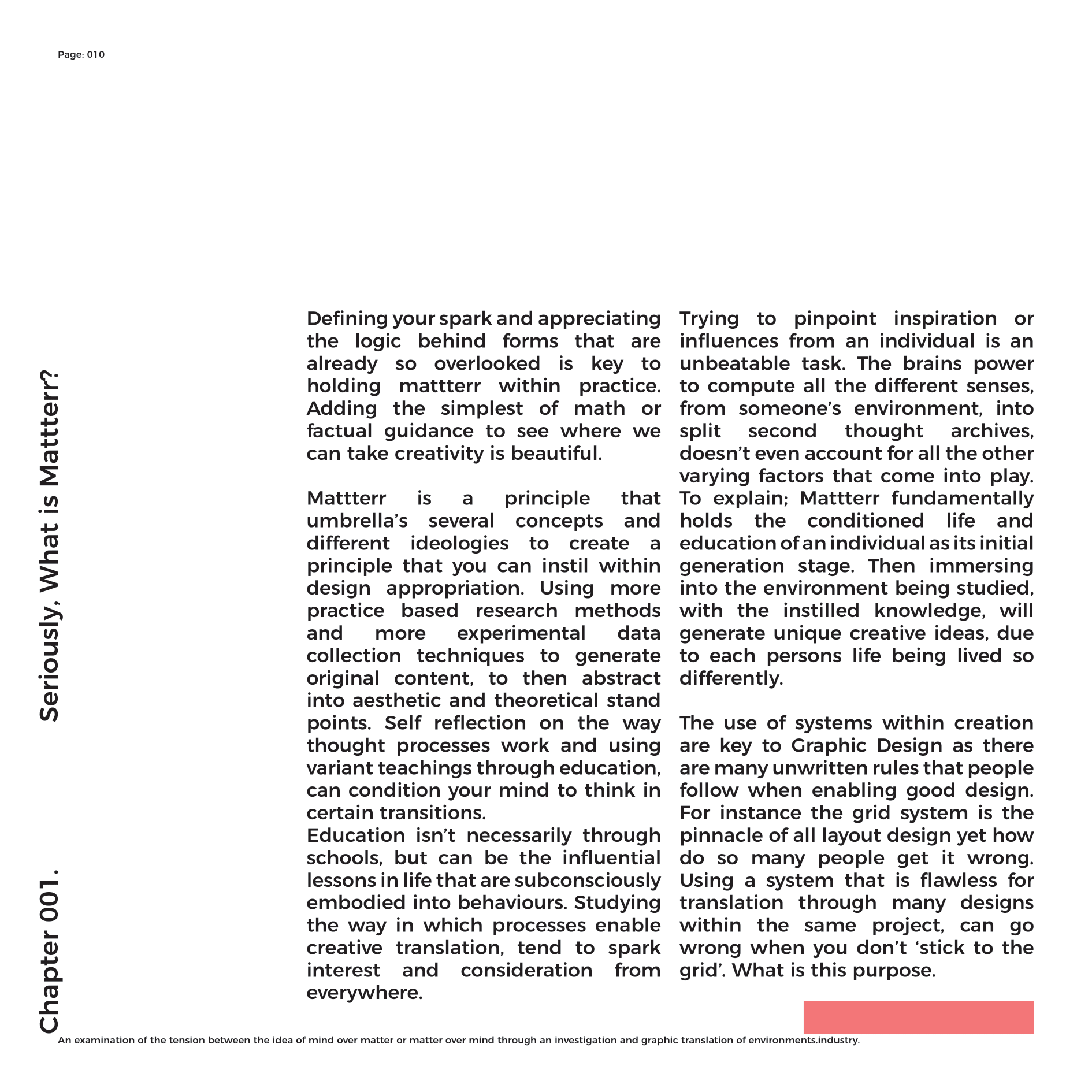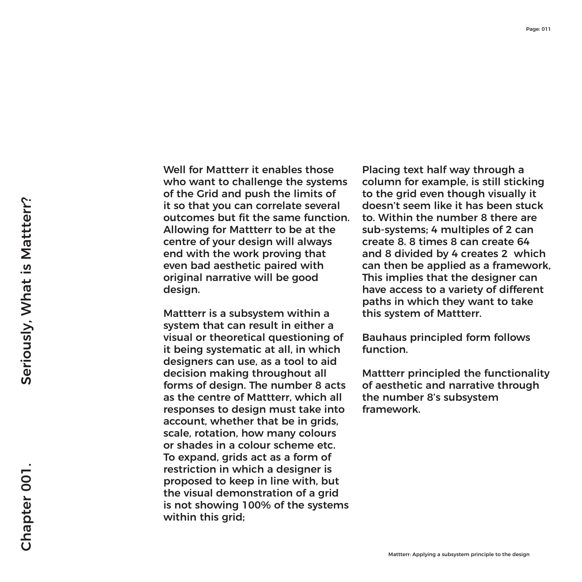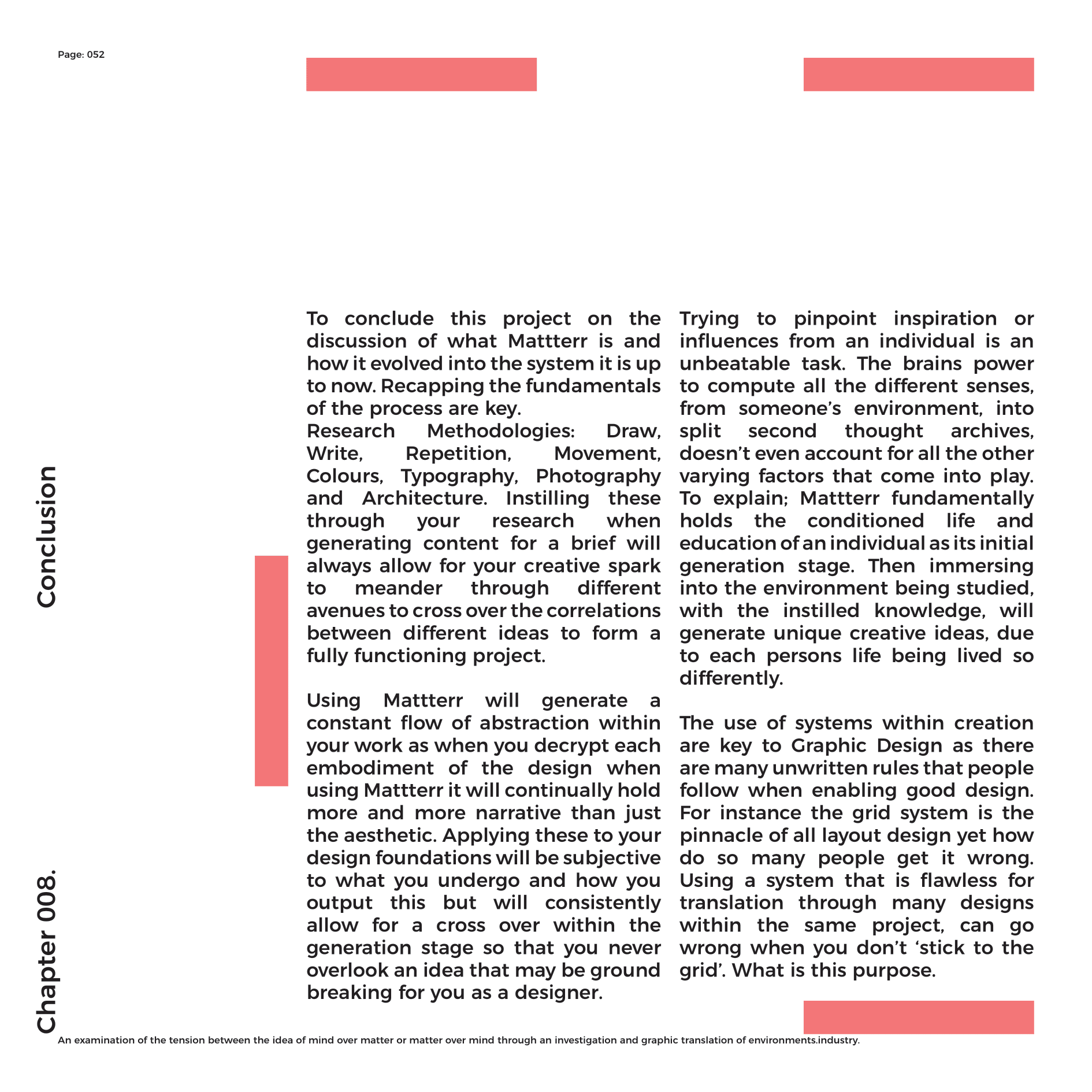 Being a lineal thinker that never has an end-point, working on projects always arrives at different outcomes due to the content behind the project and the direction the specifics of the project push you into. Immersing yourself into a brief, surrounding yourself with research and different influences that either relate or don’t directly, still enable the process of conditioning to take effect. Mattterr is the ideology that this process, matched with other logic and thought provoking thesis enable a framework to help aid the elements of indecision within working.Bauhaus principled form follows function. Mattterr principles creativity is an embodiment of your environment.