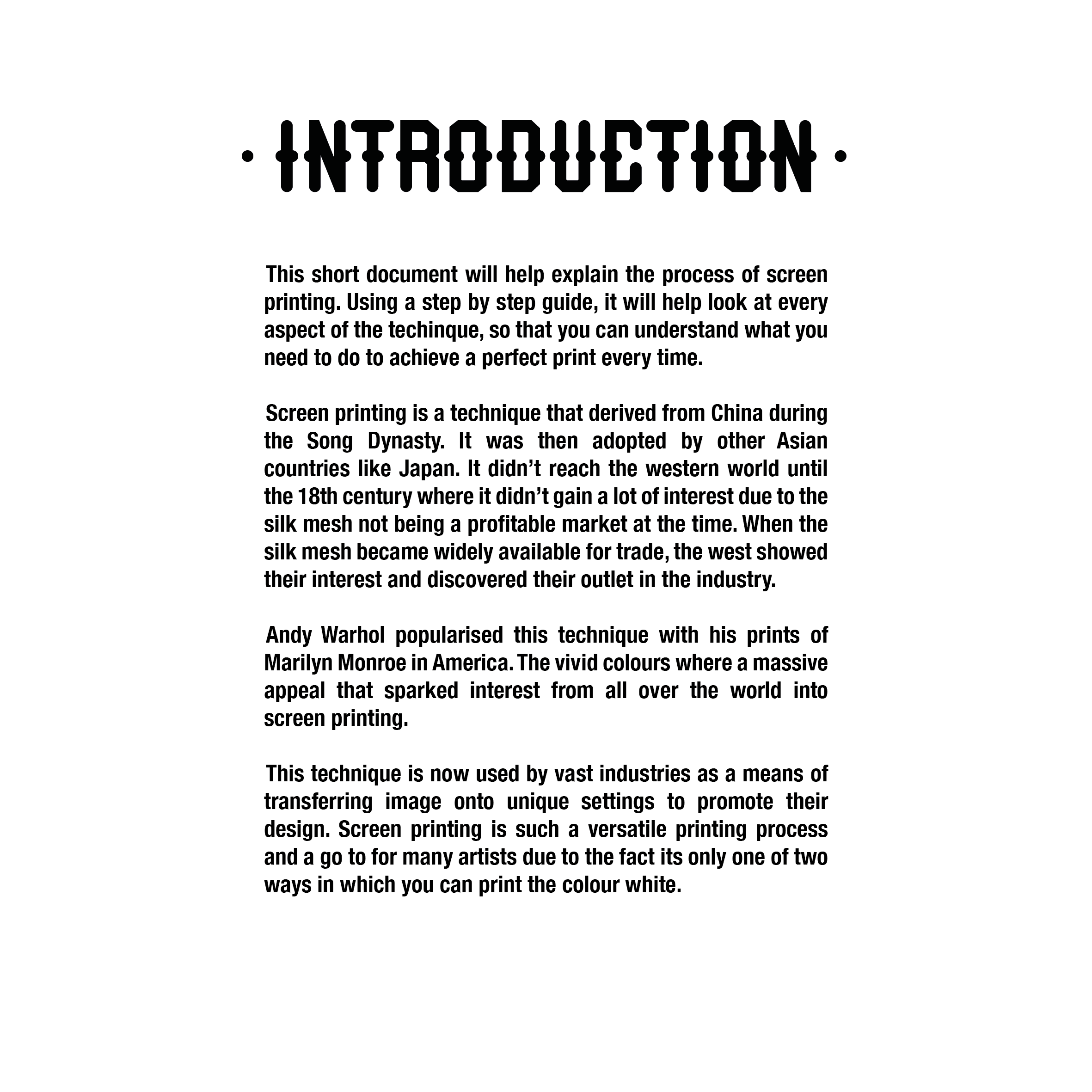 Screen printing is a method of printing where you stretch a silk mesh over a wooden or metal frame to which you then cover the mesh in emulsion and make this impermeable by adding a blocking stencil. Usually it’s an image printed on acetate, then its exposed into the emulsion by a light. A squeegee is dragged over the exposed mesh to flood it with ink, and then the whole screen is pushed down onto the material where the squeegee drags a second coat of ink over the exposed part of the screen, which therefore transfers the ink onto the material.
